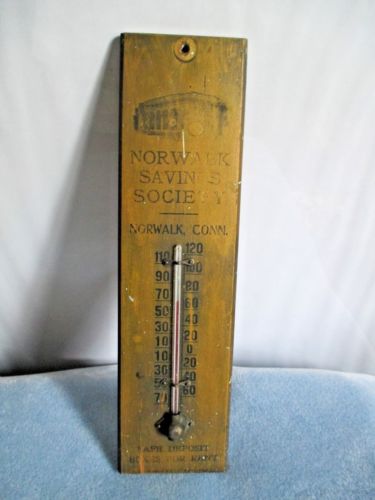 Title (ebay affiliate link): Vintage Norwalk CT Savings Society Bank Wooden Advertising Thermometer Working