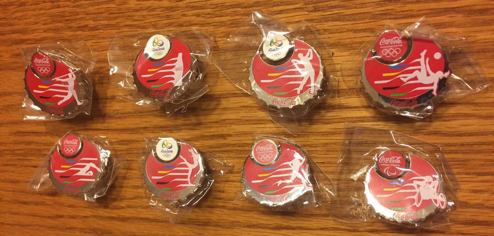 Title (ebay affiliate link): Coke Coca-Cola 2016 Rio Olympics Spinner Pins Set of 8 Complete Sealed New