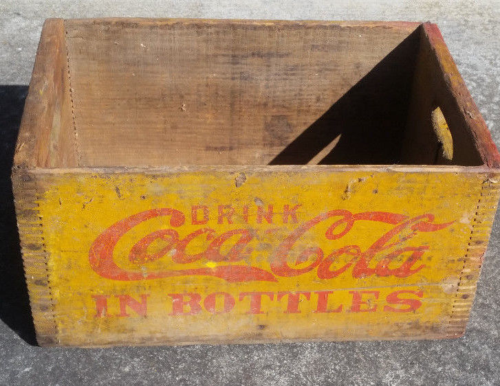 Title (ebay affiliate link): Yellow wooden Coca-Cola crate circa 1940s with red lettering (box jointed)