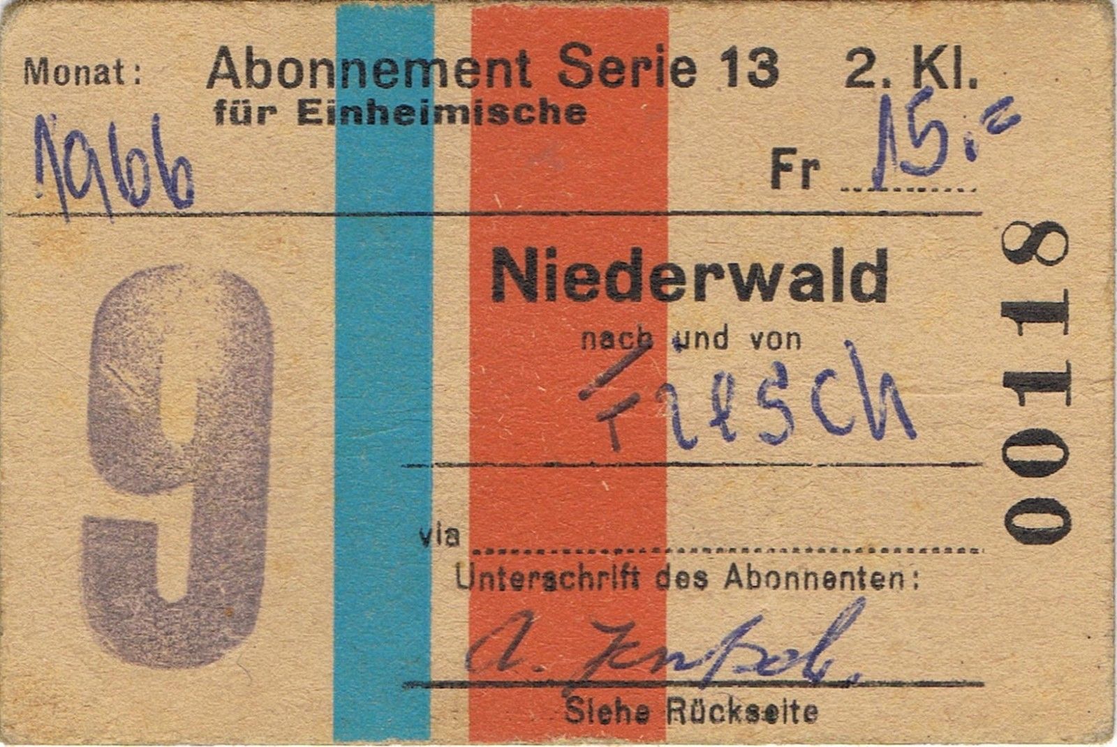 Railway tickets Switzerland Niederwald Fiesch well used and worn pass 1966