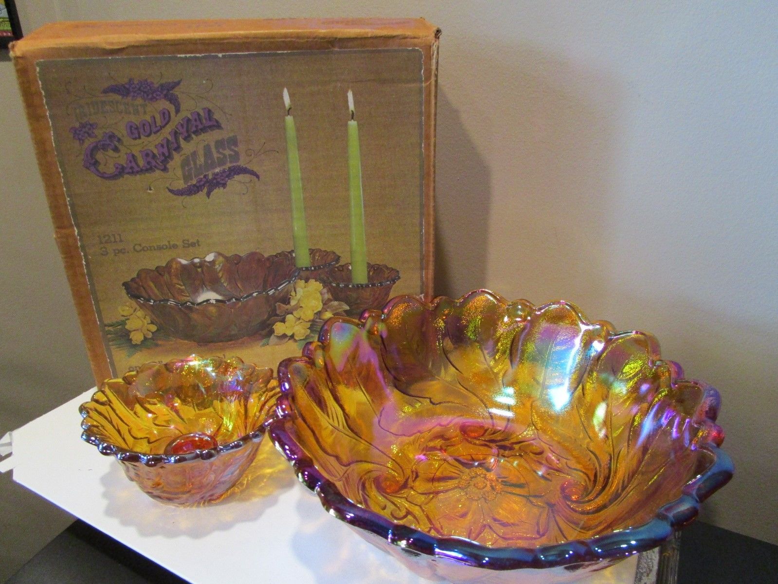 Title (ebay affiliate link): Vintage Depression Glass Iridescent Gold Indiana Glass Console Set Original Box