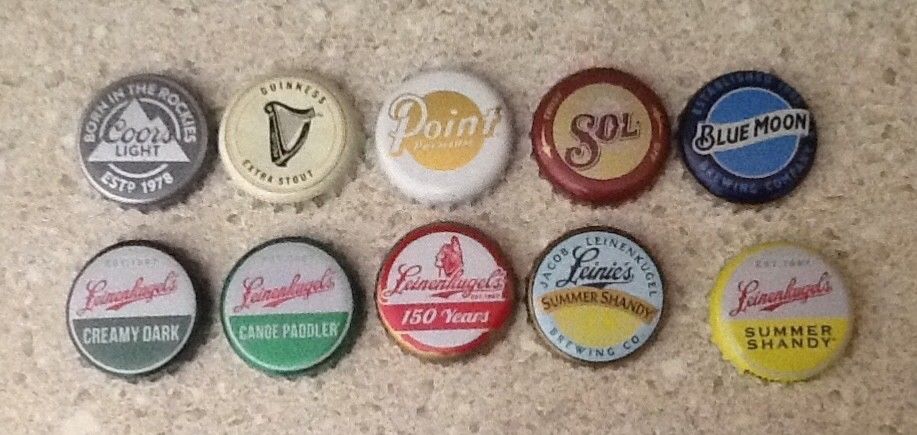 Title (ebay affiliate link): TEN BEER BOTTLE CAPS TOPS CROWNS LEINENKUGEL POINT COORS BLUE MOON SOL CERVEZA