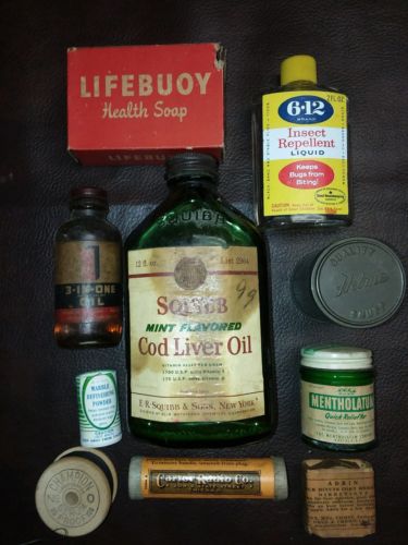 Lot of 10 Antique Tins/ Containers/ Bottles./ Misc