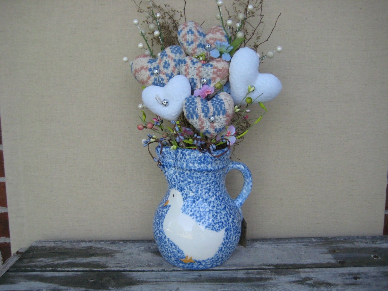 Title (ebay affiliate link): Prim Antique Woven Coverlet Hearts in a Ceramic Pitcher Floral Table Arrangement