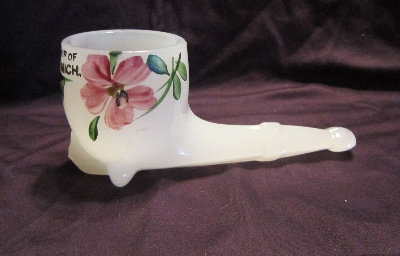 Title (ebay affiliate link): SOUVENIR OF FLINT MICHIGAN MICH OPALESCENT MILK GLASS PIPE HAND PAINTED F245