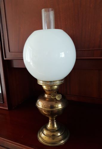 Title (ebay affiliate link): antique/vintage dupex brass oil lamp with milk glass shade and glass chimney