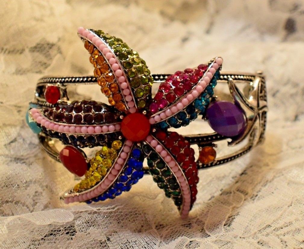 Title (ebay affiliate link): VINTAGE? PINK MILK GLASS MULTI COLOR RHINESTONE SILVER TONE CLAMPER BRACELET 385