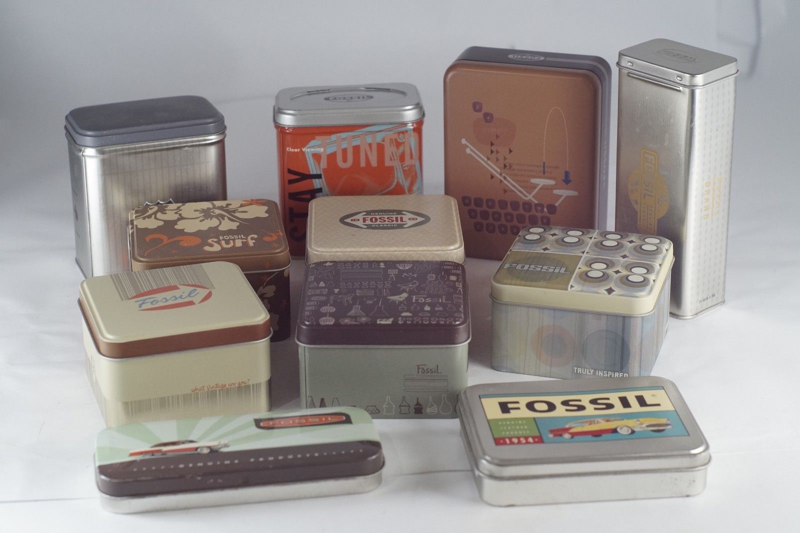 Title (ebay affiliate link): LOT OF 11 FOSSIL TIN EMPTY BOXES WATCH JEWELRY COLLECTORS VTG