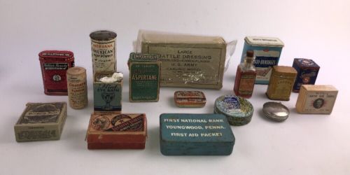 Title (ebay affiliate link): Lot 17 Vintage Antique Advertising Medical Tins Mexsana Laxatives Poison Bottle