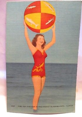 Title (ebay affiliate link): WWII RISQUE POSTCARD TIME OUT FOR FUN ORANGE BLOSSOM ST. GIRL BATHING SUIT BALL