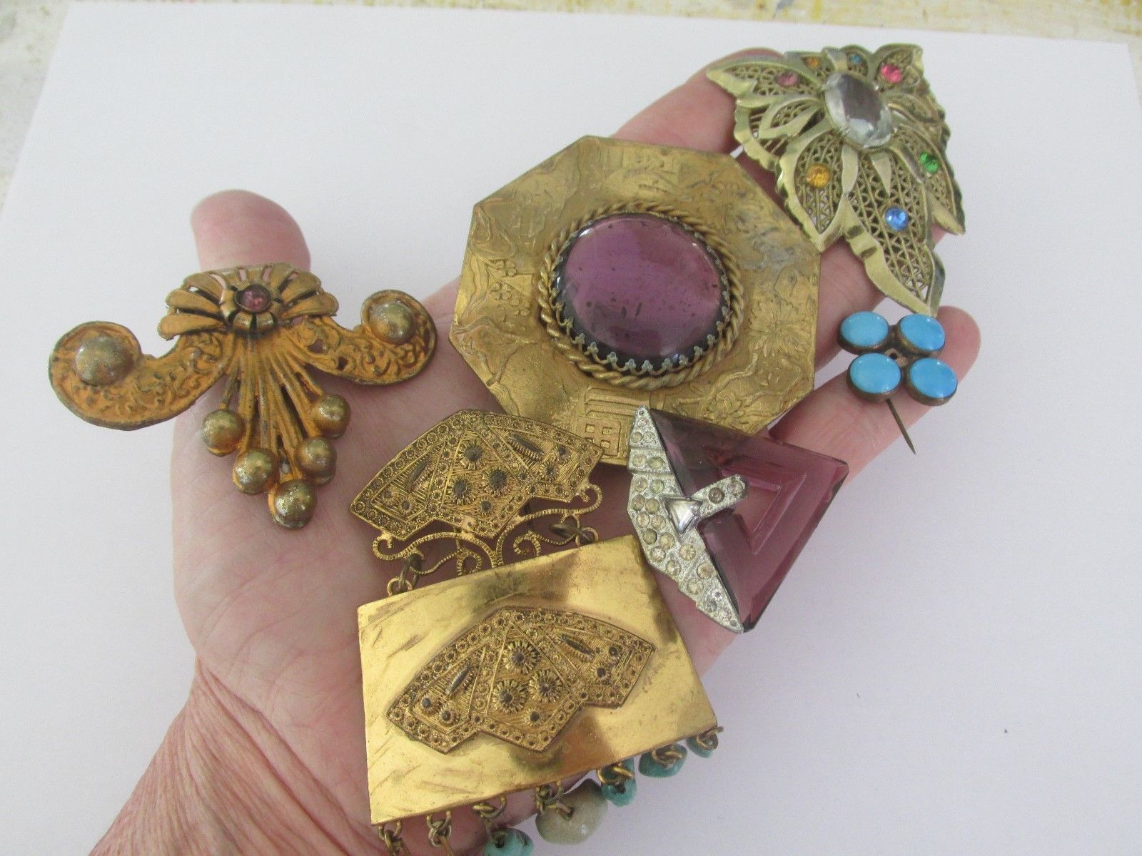6 Vintage Antique Art Deco Nouveau Rhinestone Turquoise Dress Fur Scarf Clip Lot