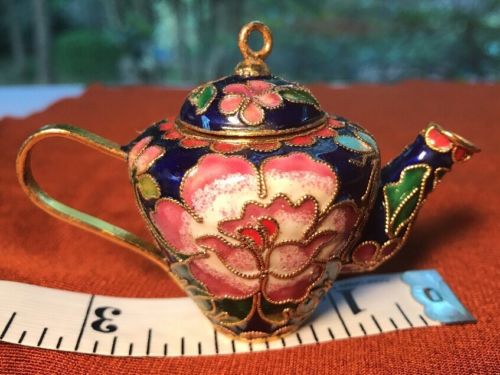 Title (ebay affiliate link): Ornate Miniature Tea Pot w Lid Gold Trim Blue with Colorful Flowers Butterflies