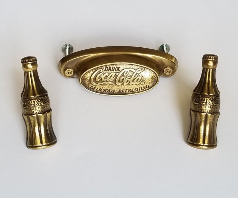 Title (ebay affiliate link): Brand New Vintage Solid Brass Coca-Cola Logo Drawer Pull and Bottle Shaped Knobs