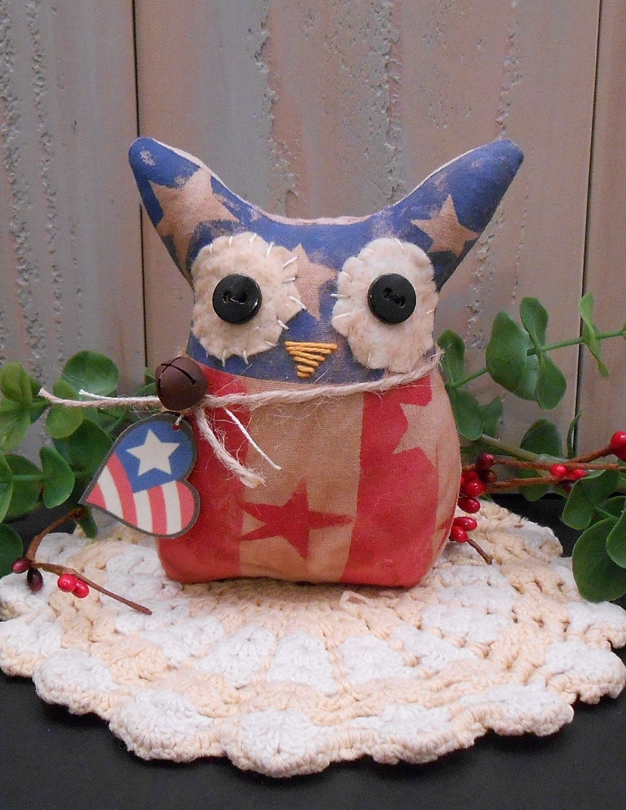 Title (ebay affiliate link): Primitive Raggedy Owl Doll Americana Patriotic Handcrafted Home Decor Folk Art a