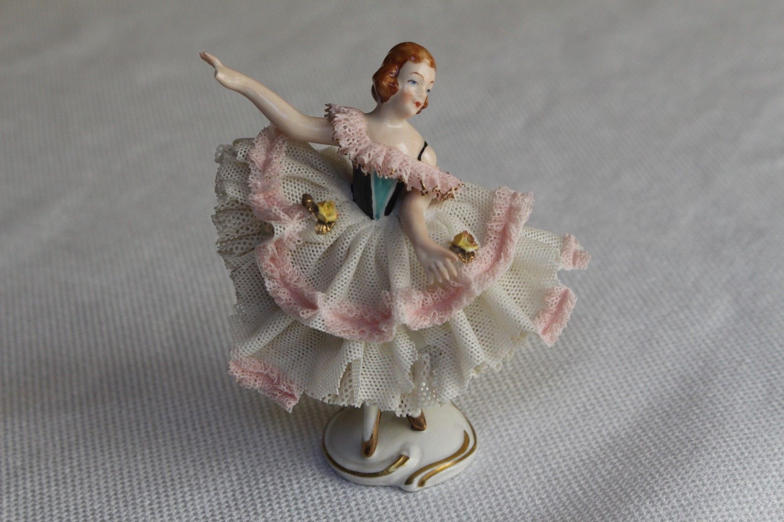 Antique Dresden girl on a lace skirt figurine, Alka, Germany