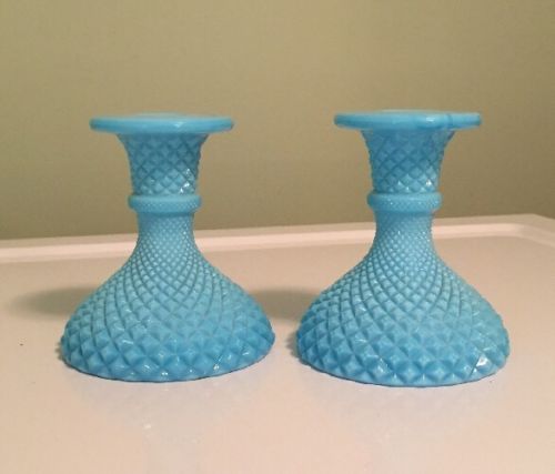 2 Vintage Candle Holders WESTMORELAND Blue Milk Glass Slag Glass ENGLISH HOBNAIL