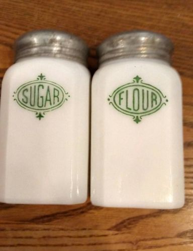 Sugar and Flour shakers white with green lettering milk glass with lids