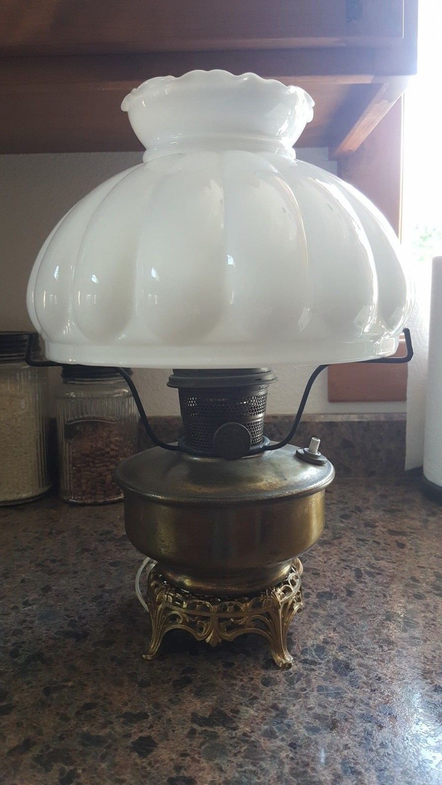 Upcycled electric Aladdin oil lamp w/ 10" milkglass shade