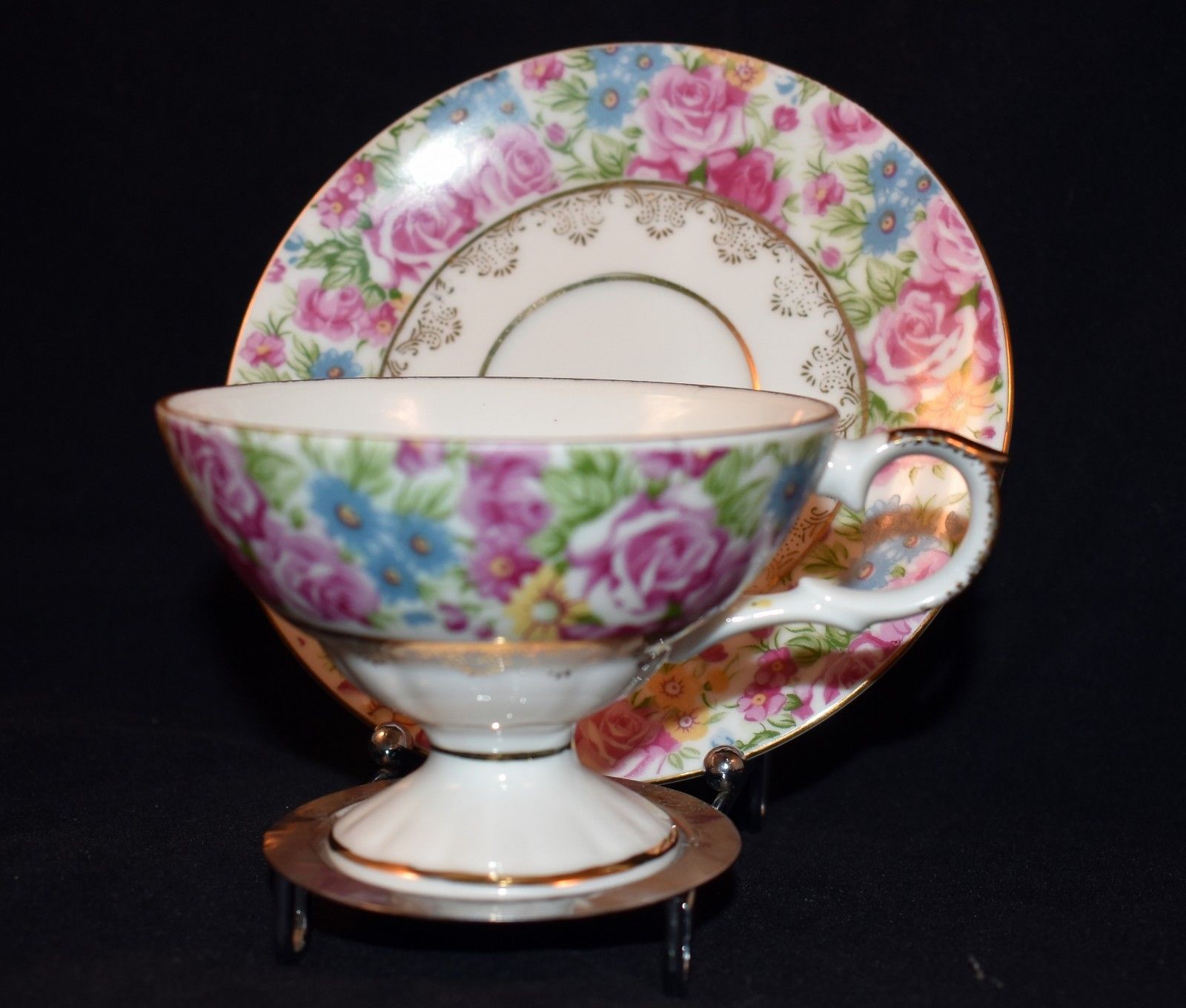 Vintage Enesco Footed Tea Cup and Saucer Roses Floral Gold Gild EUC