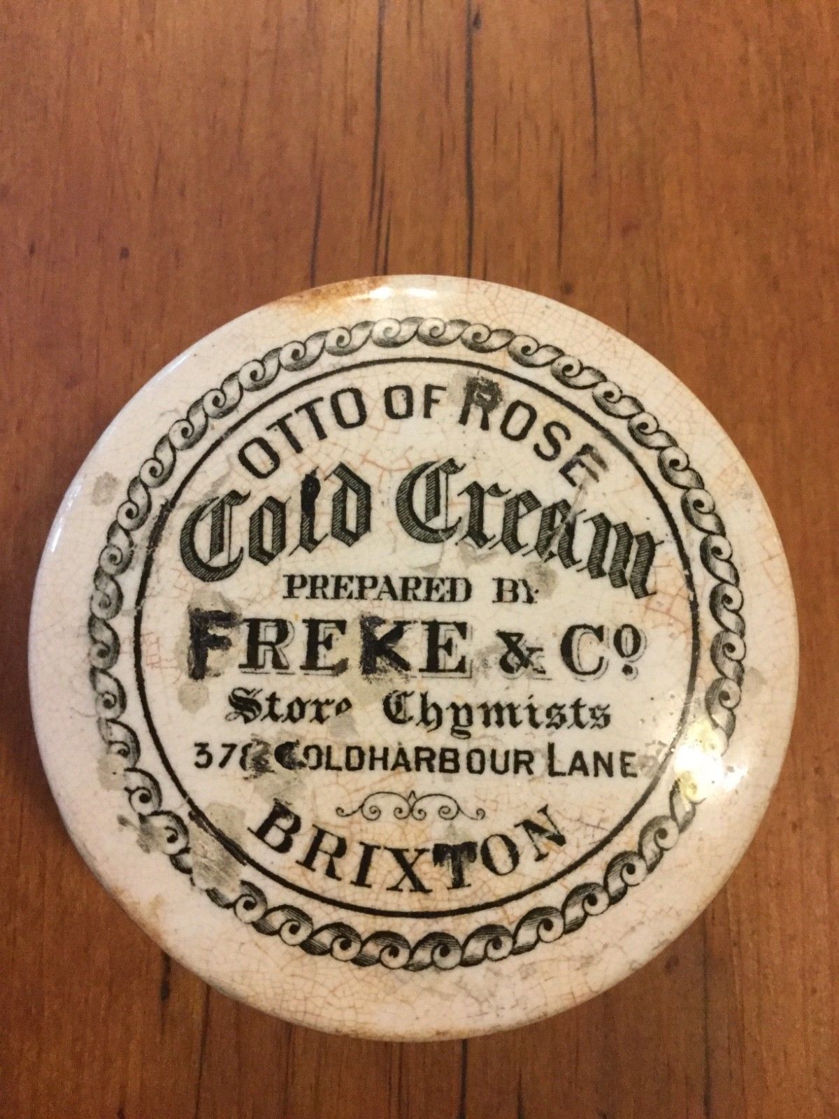 Title (ebay affiliate link): Antique advertizing STONEWARE Otto of Rose coldcream jar Brixton England dug Old