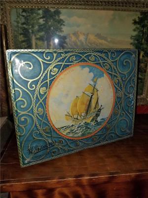 Vintage Whitman''s Chocolates Candy Tin Santa Maria Ship Geometric Blue Gold 9X7