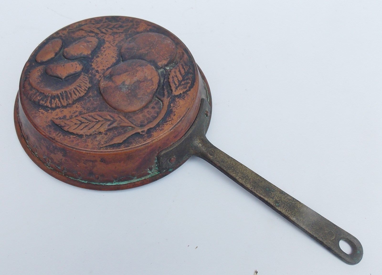 Title (ebay affiliate link): Antique Copper and Brass Sauce Pan with Embossed Chestnuts and Apples