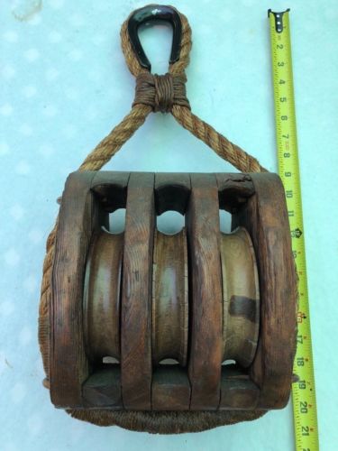 Title (ebay affiliate link): Large Vintage Three Sheave pulley -Wood Sheaves - Rope Strapped