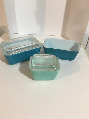 LOT OF 3 VINTAGE PYREX BLUE & TEAL DELPHITE REFRIGERATOR DISH MILK GLASS LIDS