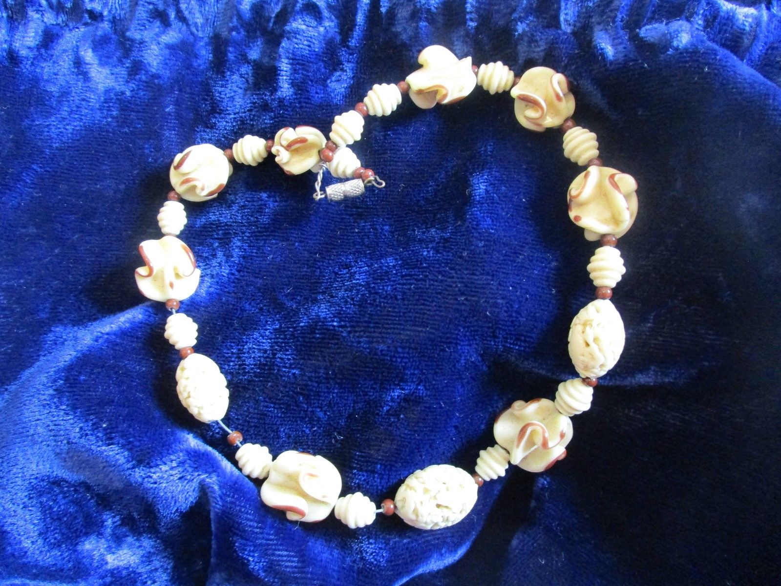 Title (ebay affiliate link): Vintage Deco Czech Bohemian Unusual Pressed Milk Glass Bead Necklace Neiger?