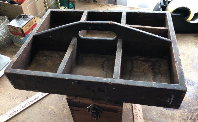 Title (ebay affiliate link): Antique Handmade Wood Tool Box Screw Nail Hardware Carrier Carpenters Tote