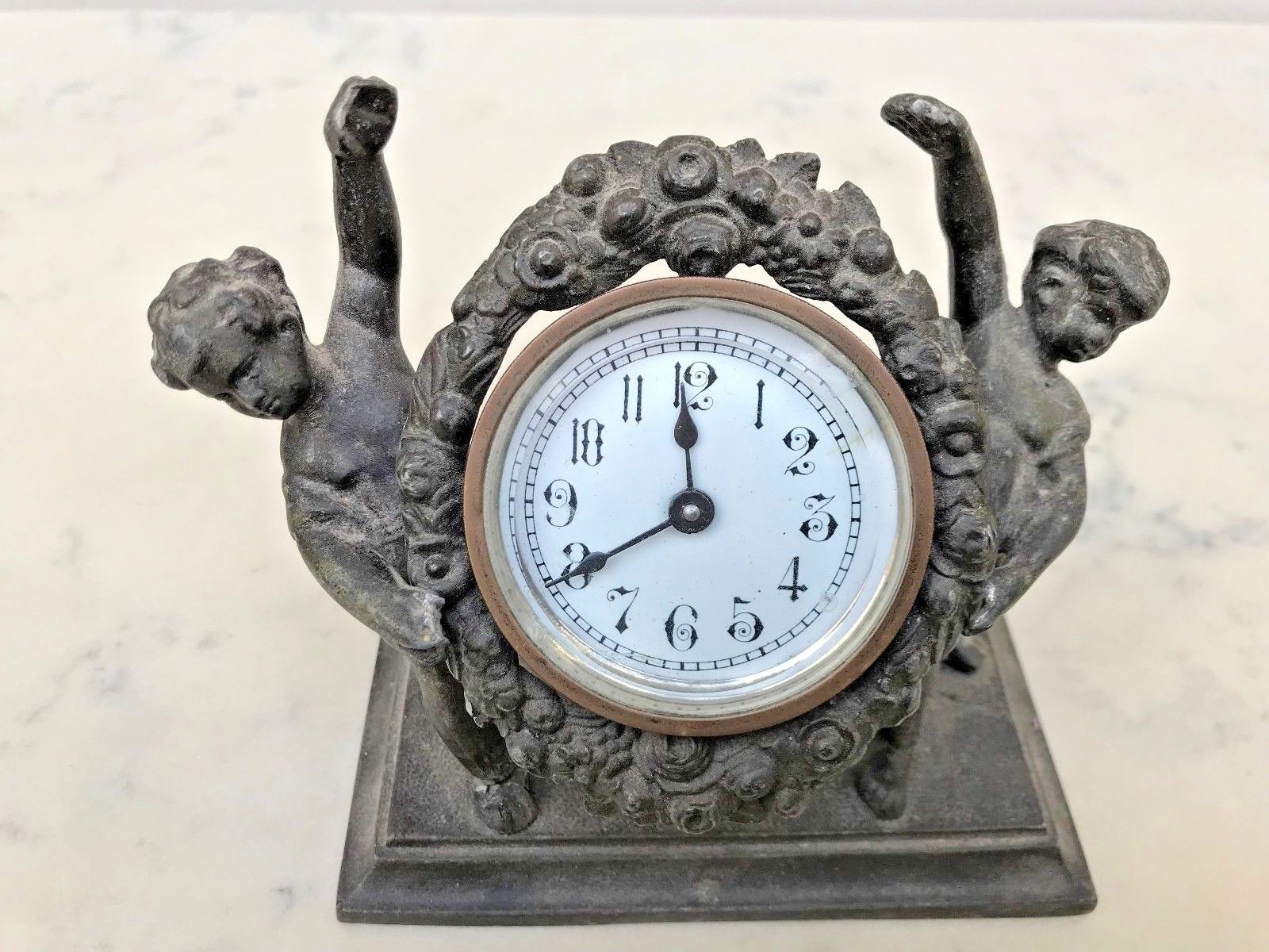Title (ebay affiliate link): Early c. Ansonia 8D Time Piece Cast Iron Bedroom Clock w/2 Cherubs Holding Clock