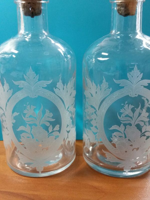 Title (ebay affiliate link): Antique Etched Apothecary Glass Bottles (2) w/Silver Stoppers Flower Leaf Design