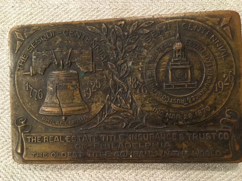 Title (ebay affiliate link): Brass Paper Weight 1776-1926 Real Estate Title Insurance Trust Co Philadelphia