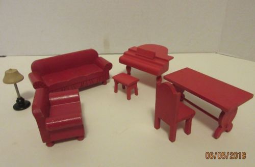 7 pc. Vintage Antique Wood Doll House Furniture Piano Carved sofa & chair, Table
