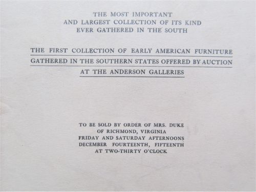 Caroline Coleman Duke Collection Early Amer. Furn. 1923 auction catalog southern