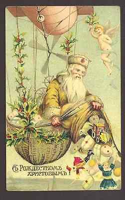 Russian Santa Claus with Toys Bag Flying in Balloon Zeppelin Postcard, Rare,