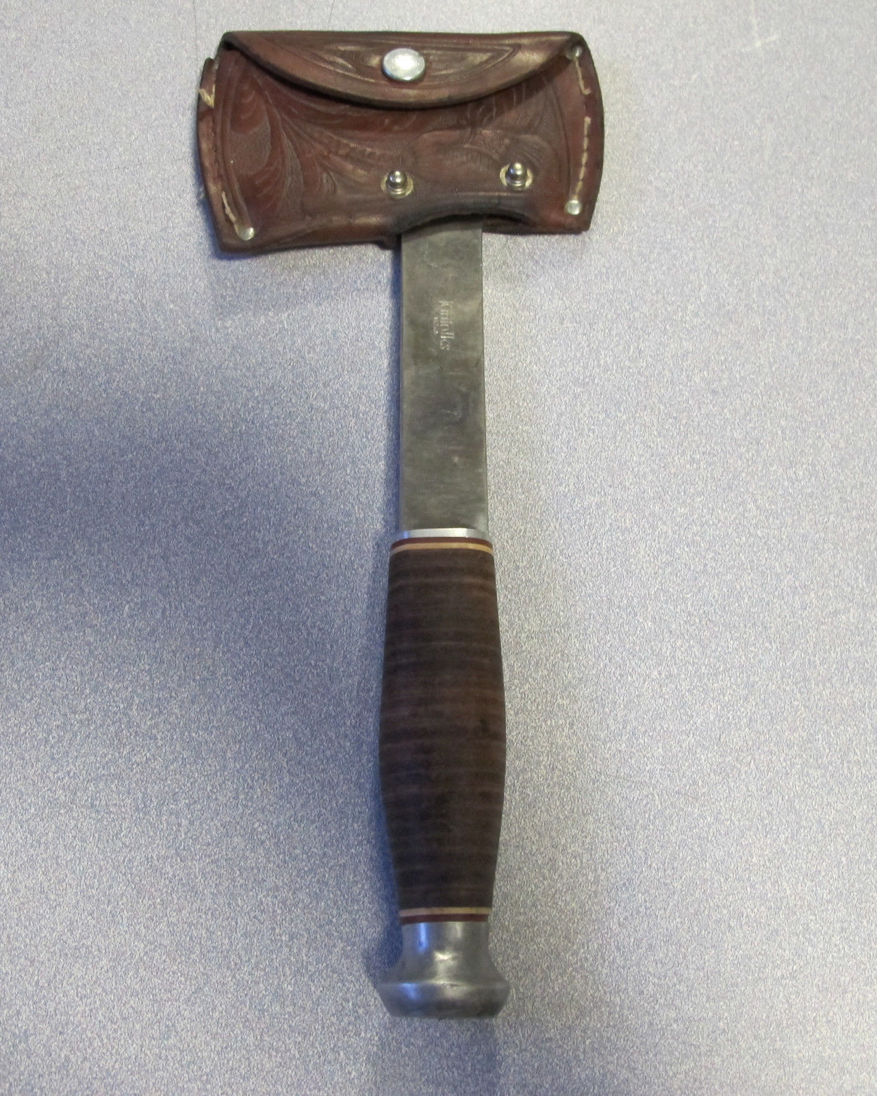 Title (ebay affiliate link): Vintage Kinfolks U.S.A Leather Handle Hatchet With Leather Sheath