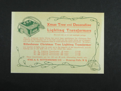 Title (ebay affiliate link): Vintage 1920s CHRISTMAS TREE LIGHT TRANSFORMER adv trade card HONEOYE FALLS NY