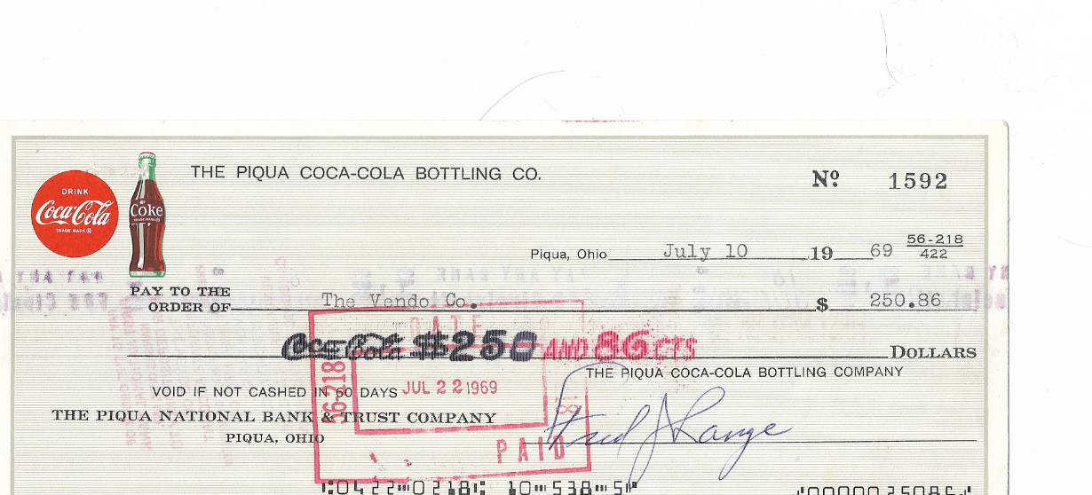 Title (ebay affiliate link): PIQUA COCA-COLA BOTTLING CO CHECK 1969 OHIO