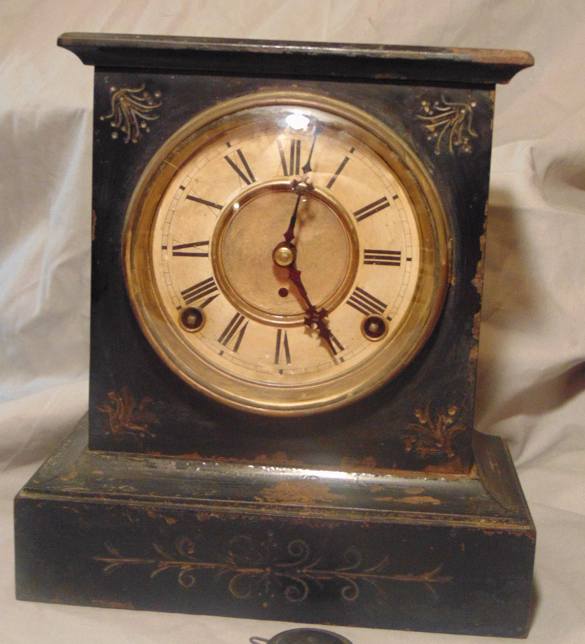 Title (ebay affiliate link): Antique Iron Case Mantel Clock w/ Pendulum Unknown Maker Estate Fresh