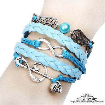 Title (ebay affiliate link): NEW Infinity music skull symbol Antique Silver Leather Charm Bracelet B10