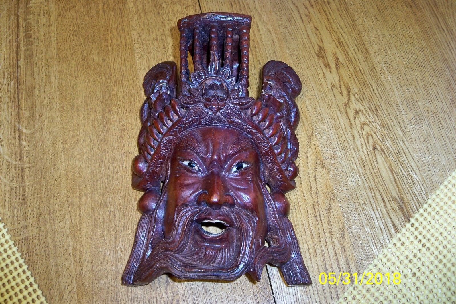 Title (ebay affiliate link): Vintage Hand Carved dark Wood samurai Asian head dress face/ mask Devil Dog