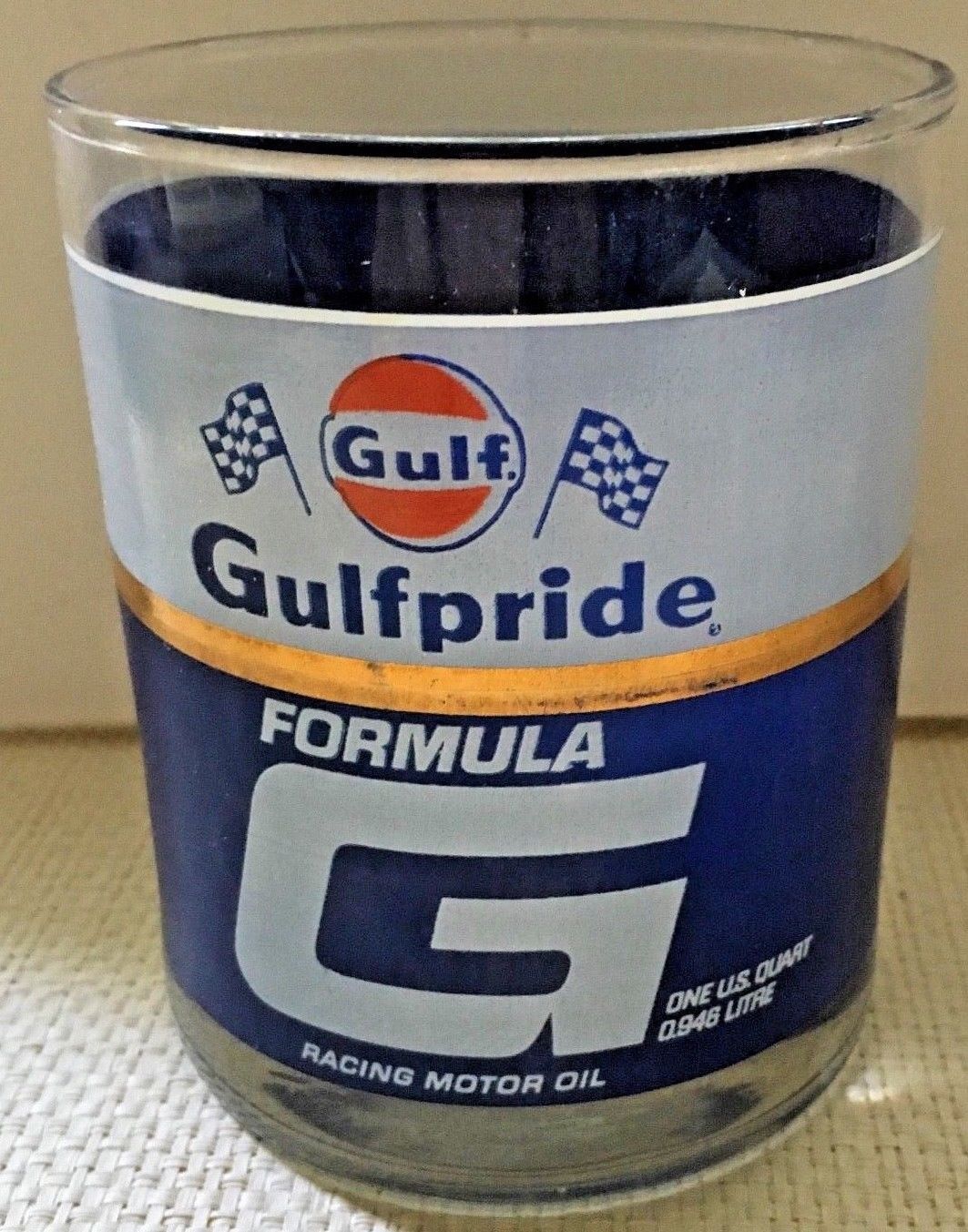 Vintage 60s Gulfpride Formula G Racing Oil Rocks Glass 9 oz Blue White Gold