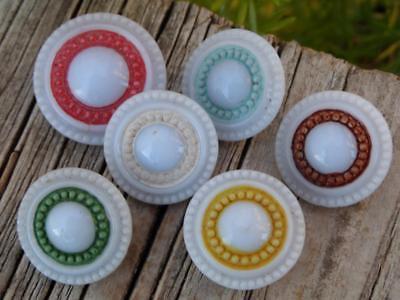 (6) Vintage White w/ Colored Rings Depression Era Art Deco Glass buttons Samples