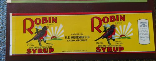 Title (ebay affiliate link): ROBIN CANE SYRUP CAN LABEL File Copy 1930''s rare W.B. RODDENBERRY CAIRO GEORGIA