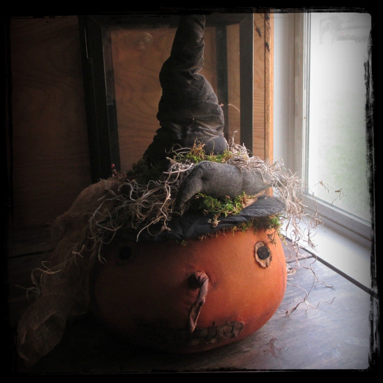 Title (ebay affiliate link): Primitive Orange Halloween Jack-O-Lantern Pumpkin Witch w/Crow Doll Sitter LARGE