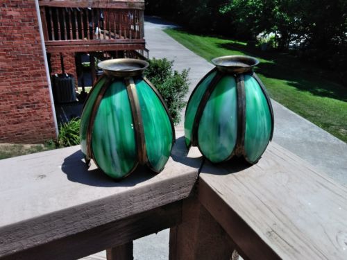 antique victorian green leaded slag stain glass tulip lamp shade