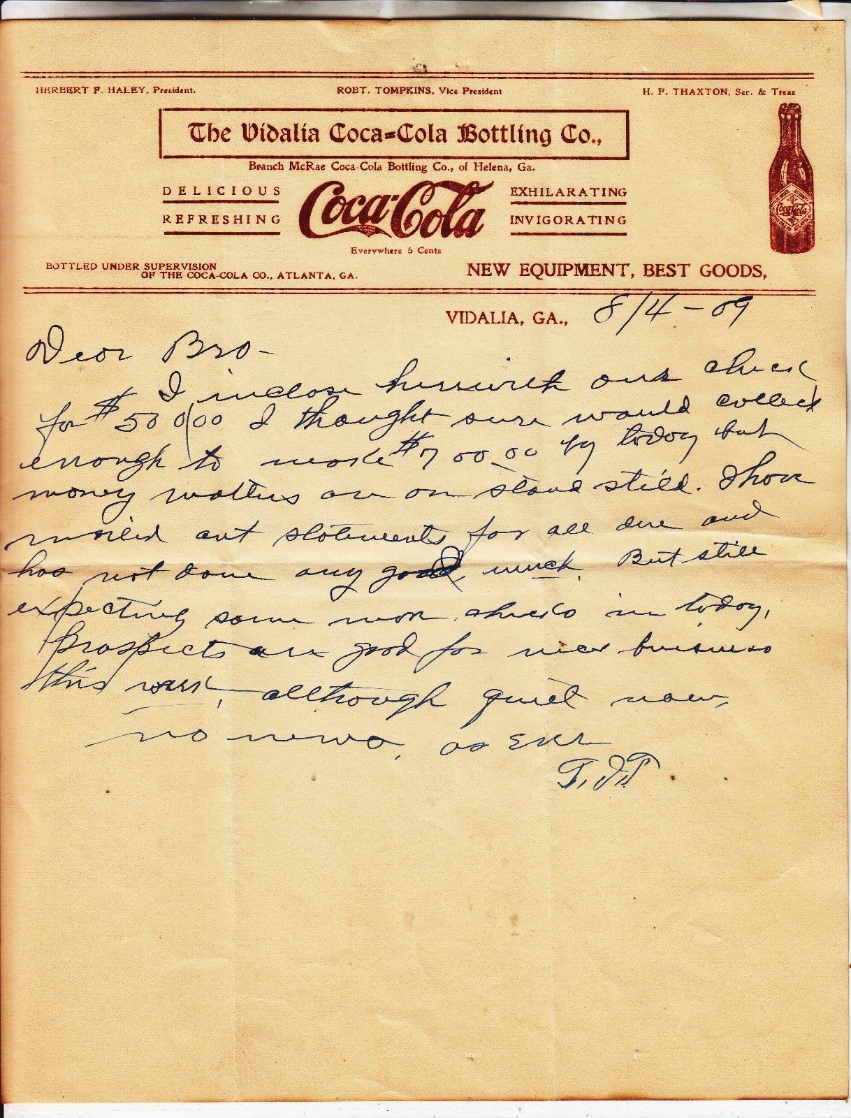 THE VIDALIA COCA-COLA BOTTLING CO.LETTERHEAD DATED 8/4 - 09 109 YEARS OLD