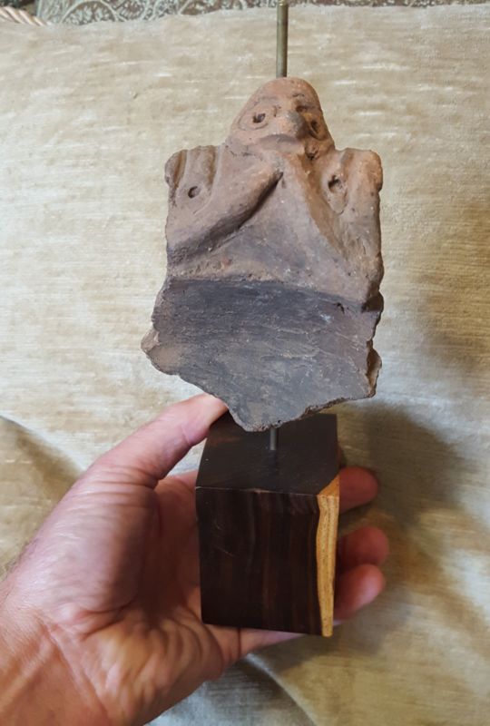 Title (ebay affiliate link): Ancient pre-Columbian Custom Mounted Pottery Artifact Figural Male Crossed Arms
