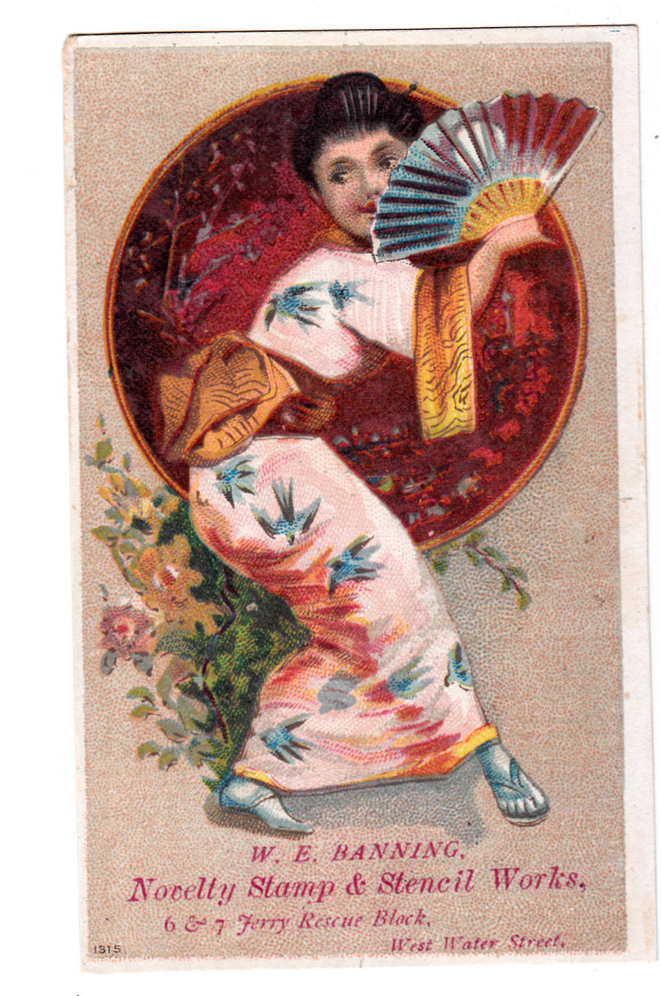 Title (ebay affiliate link): W E Banning Novelty Stamp & Stencil Works Ferry Rescue Block Japanese Fan c1880s